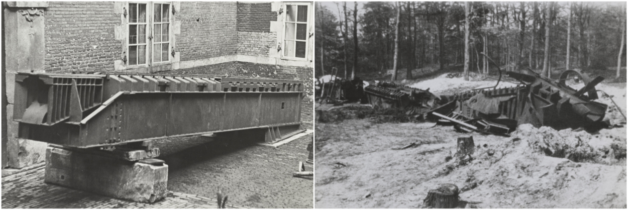 Op een open plek in een bos liggen de restanten van een V-1 lanceerinstallatie. Op de rechterfoto staat een gedeelte van de afschietbaan.
