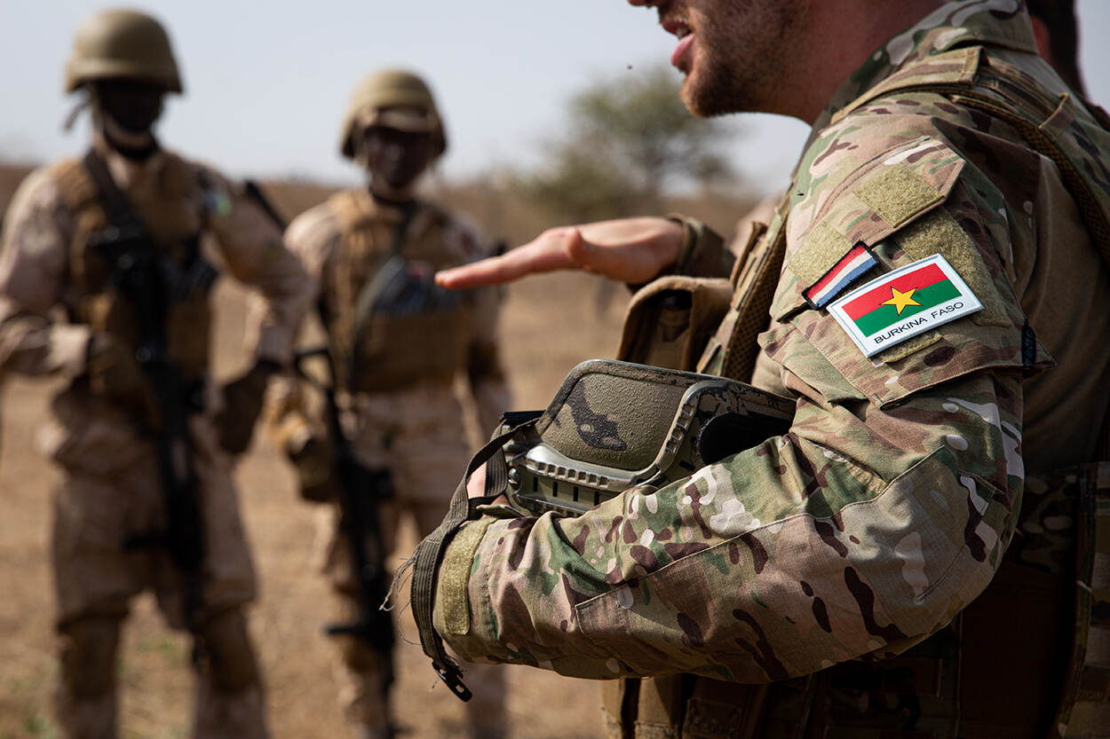 Ademloos luisteren militairen uit Burkina Faso naar de uitleg van hun Nederlandse collega. Foto: Sergeant Steven Lewis.