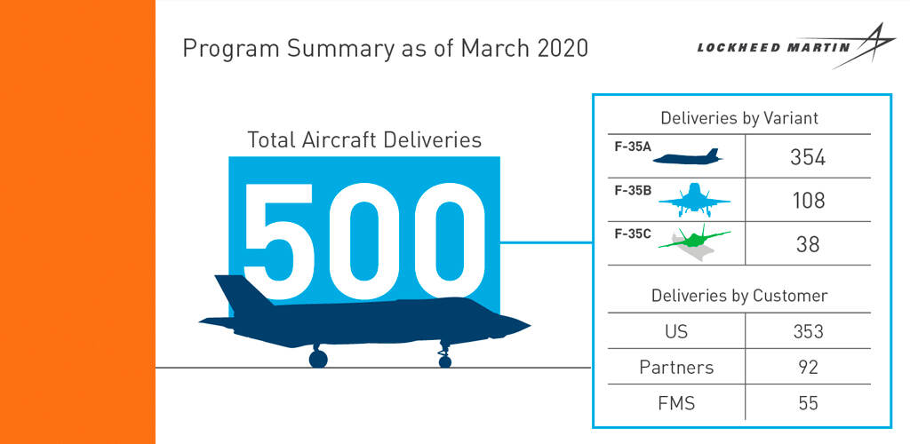 Vliegtuigfabrikant Lockheed Martin meldt dat deze week de 500e F-35 Lightning II is afgeleverd. En in februari werd het 250.000ste vlieguur met het toestel gevlogen, dat opereert vanaf 23 vliegbases in de hele wereld.