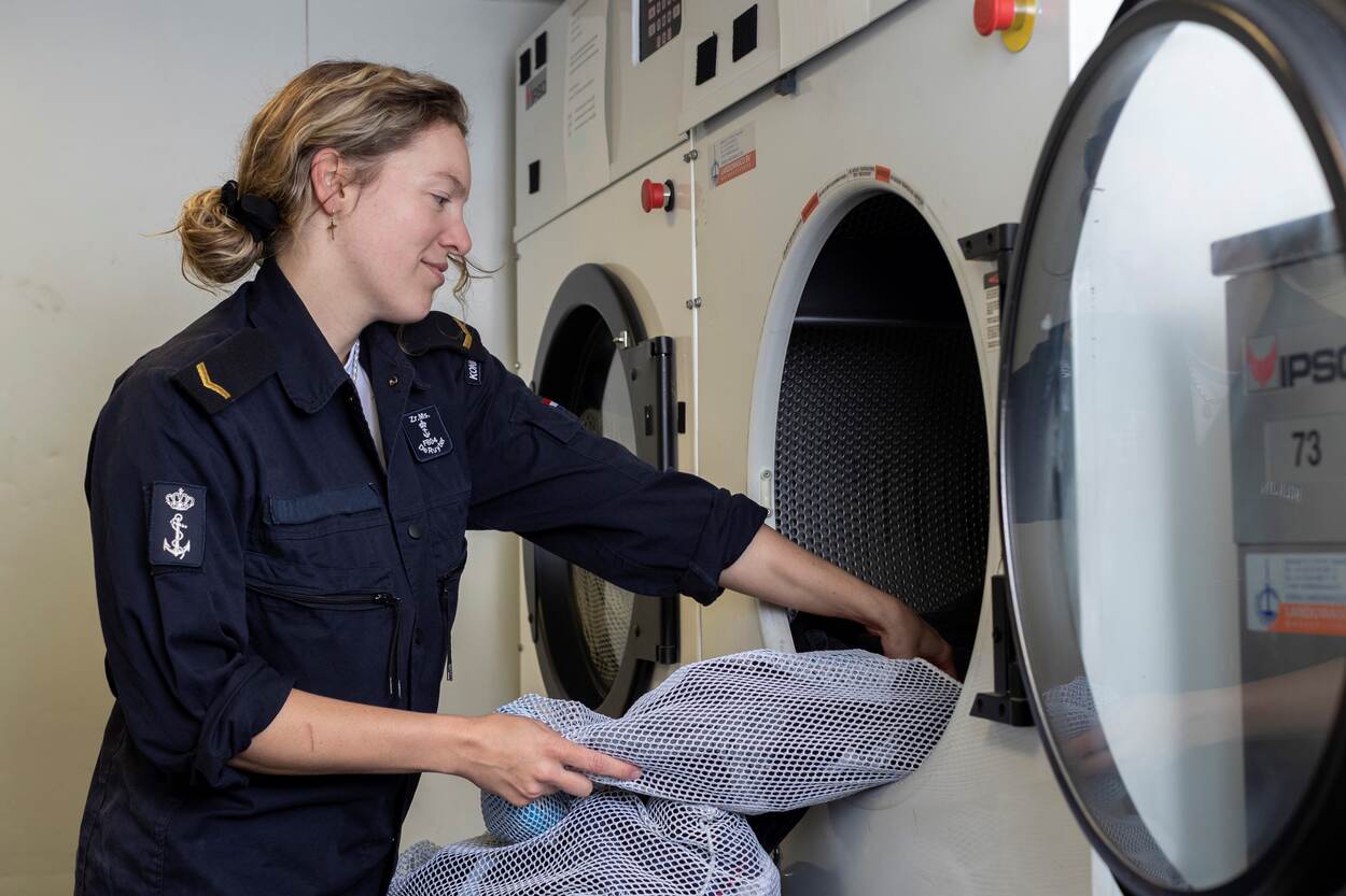 Het is wasdag. Matroos Mireille is de wasser aan boord. Ze heeft een functie waar niet vaak bij stil wordt gestaan, maar als er een wasdag zou worden overgeslagen weet ik zeker dat de reacties aan boord niet mals zijn. Ten midden van ontelbare stapels schoon beddengoed, ongewassen volle wasnetten en ronkend witgoed werkt ze klokje rond om kleine, maar vooral grote wasjes weg te werken.