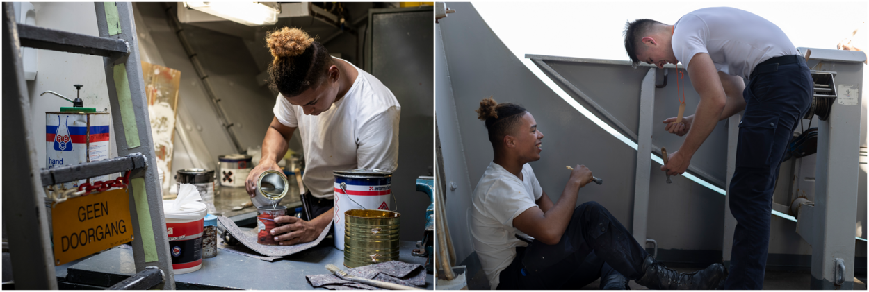 Zo af en toe haal ik een frisse neus en vitamine D op de bak (voorste deel van het schip, red.). Daar 'tjetten' (schilderen) matrozen Mees (20) en Tyler (19) van de Nautische Dienst het schip fregatgrijs. Voor vertrek kwam er nogal wat commentaar op de roestige buitenkant van Zr.Ms. De Ruyter. 'Ziet er niet uit', schreven kritische topfans op social media. Maar, zo weten de nauten te vertellen, het kan helemaal geen kwaad. Het schilderen is puur cosmetisch. De roest komt er vanzelf weer doorheen. Bovendien kon er in de winter in de haven van Den Helder niet geschilderd worden, dus het was niet anders. "We hebben in ieder geval genoeg grijze verf bij ons."