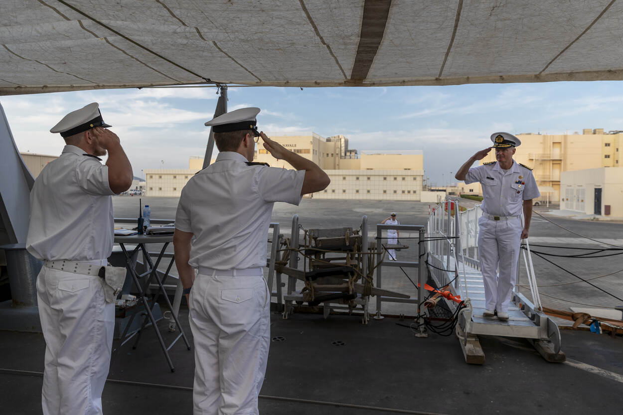 Vlak voor vertrek bezoeken minister van Buitenlandse Zaken Stef Blok en Commandant Zeestrijdkrachten vice-admiraal Rob Kramer het schip. De admiraal spreekt de bemanning toe en vertelt dat hij zich kan voorstellen dat de missie, die voornamelijk bestaat uit beeldopbouw, voor de bemanning soms best saai kan zijn. "Als je er in de komende 5 maanden even doorheen zit, houd je dan vast aan het feit dat onze aanwezigheid hier alleen al ontzettend belangrijk is.” Hij wenst ons: fair winds and following seas