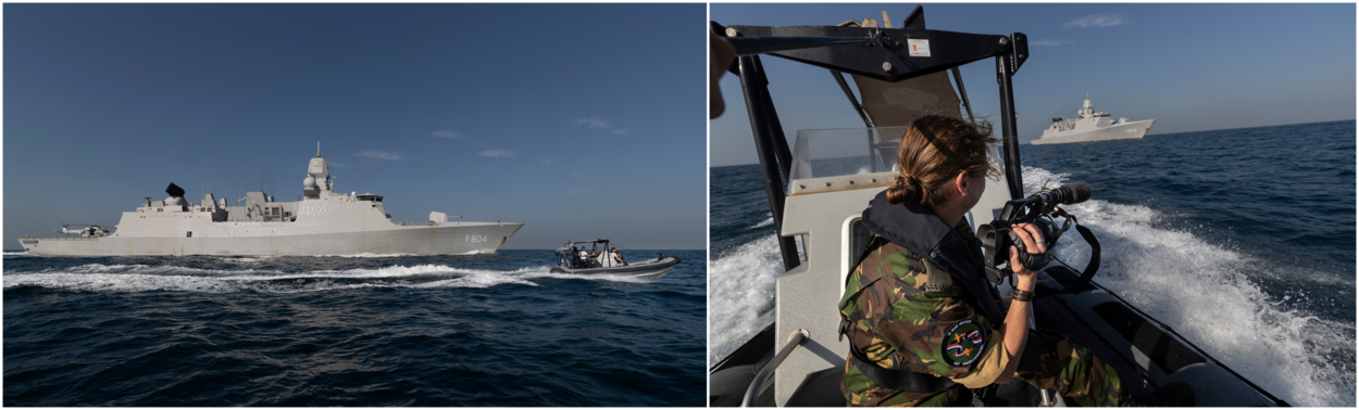 Ons mediateam is inmiddels een week aan boord en maakte talloze foto's en video's in het schip. Maar de buitenkant van 'de parel', zoals commandant Klootwijk zijn fregat noemt, is voor het team ook belangrijk om vast te leggen. Daarom varen we mee met de Rhib, een kleine, snelle motorboot. Ik stap in op het hoogste dek. Het schuitje wordt langs het schip met kabels naar beneden gevierd. Ik houd mijn pokerface in stand als op het dek wordt gegrapt: 'houd je vast, hij wil nog weleens losraken'. Ik laat me als pleun op het water niet kennen (landmachters worden door militairen van andere krijgsmachtdelen pleunen genoemd, red.). In ruil mag ik de marinelui 'vissticks' noemen, maar dat doe ik nog even niet. Mijn leven 'hangt' immers in hun handen.