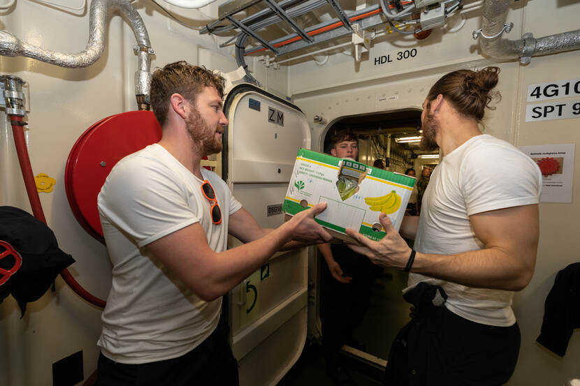 Na ruim 2 weken varen, legt Zr.Ms. De Ruyter aan in de haven van Dubai. Eerst worden 27 zakken met post van thuis aan boord gebracht. In de longroom (het ontspanningsverblijf van de officieren, red.) help ik met sorteren. Dankbaar worden stapels met pakjes, sommigen door kinderen versierd met glitters en stickers, naar de slaaphutten gebracht. Daarna is het tijd om voedsel te laden. De bemanning vormt een trein van loopbrug naar keuken om pakketten fruit, groente, yoghurt en frietjes klaar te zetten voor de komende weken.