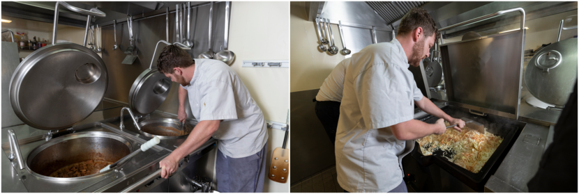 Het is 's ochtends vroeg al flink doorbeunen in de keuken, want bij de marine lunchen ze met een warme maaltijd. 's Avonds nuttigen we een broodmaaltijd met een warme snack.