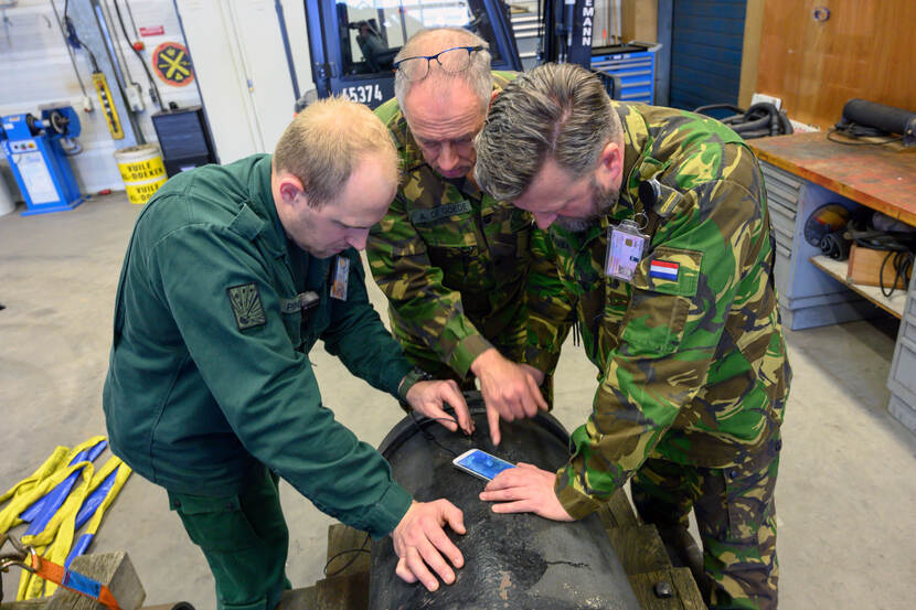 Met een minuscule camera inspecteert majoor Klaver het zundgat van kanon 2841.
