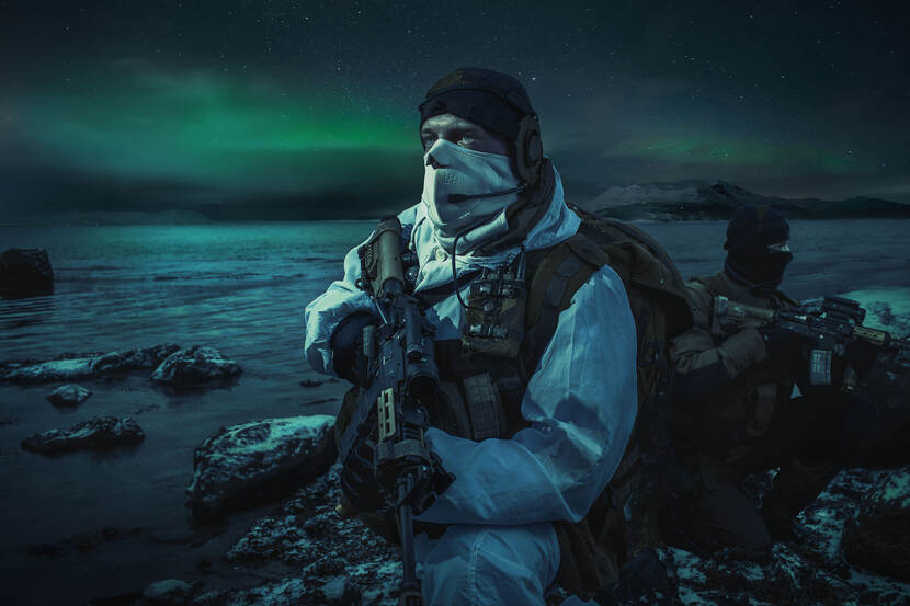 Een Nederlandse marinier verkent een mogelijke landingszone in het Noorse Ramsund, terwijl zijn collega een oogje in het zeil houdt. Sergeant Jasper Verolme won met deze foto in de categorie  'Illustrative'. Dat wil zeggen dat er gephotoshopt mag worden.