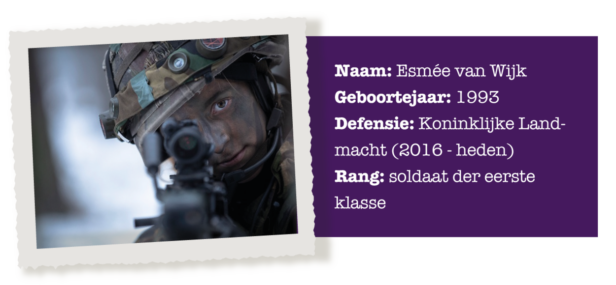 In 1944 treden de eerste vrouwen in dienst bij de Nederlandse krijgsmacht. Ze werken dan als bijvoorbeeld verpleegkundige, typiste of boekhoudster. Eind jaren 70 mogen vrouwelijke militairen ook varen, vliegen en vechten en sinds de jaren 90 voert Defensie een actief beleid om vrouwen te werven en te behouden. In deze rubriek komen de dames aan het woord die ervoor gezorgd hebben dat het na 75 jaar heel normaal is dat er vrouwen bij Defensie werken. In deze editie vertelt Esmée van Wijk haar verhaal, die alles opgaf om infanterist te worden.