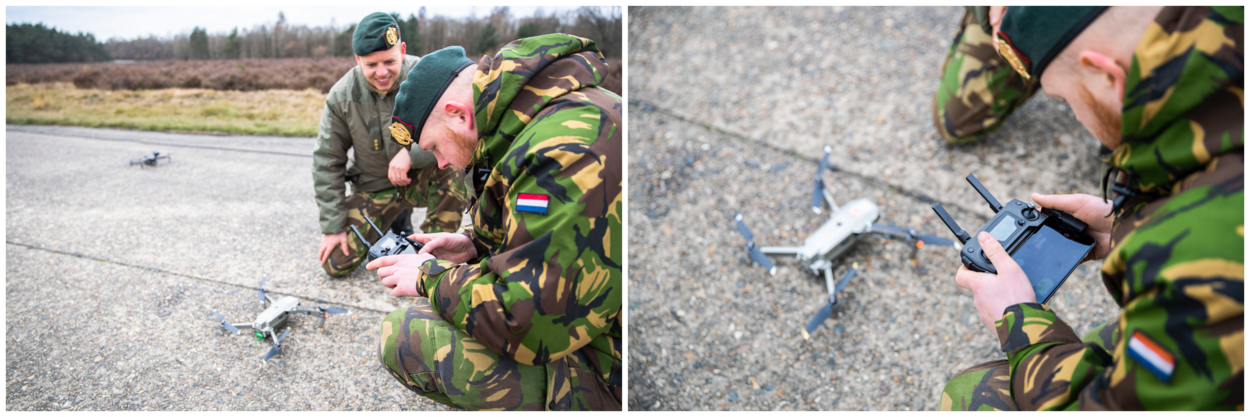 “Houd alstublieft 1.5 meter afstand”,, klinkt het uit de lucht. Boven de hoofden van overste Jules en kapitein Tom zoemt een drone met een dusdanig werkende luidspreker dat je 'm niet kunt negeren. De 2 collega's van de eenheid Robotica en Autonome Systemen (RAS) van 13 Lichte Brigade moeten volgens het oefenscenario een groep van wel 10 personen voorstellen. “Maar we houden ons ook tijdens oefeningen aan de RIVM-richtlijnen. Dus zijn we met z’n tweeën”, legt Tom uit.