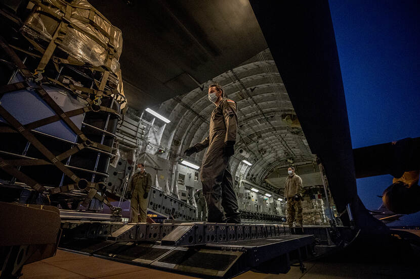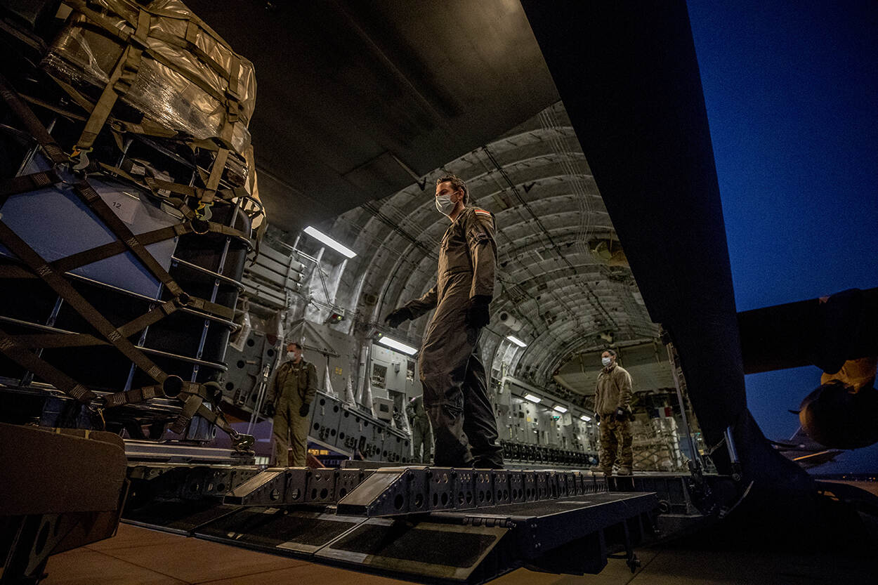 Op vliegbasis Eindhoven werd een C-17 transportvliegtuig beladen met medische apparatuur en hulpgoederen voor het Caribisch gebied. Foto: sergeant-majoor Maartje Roos