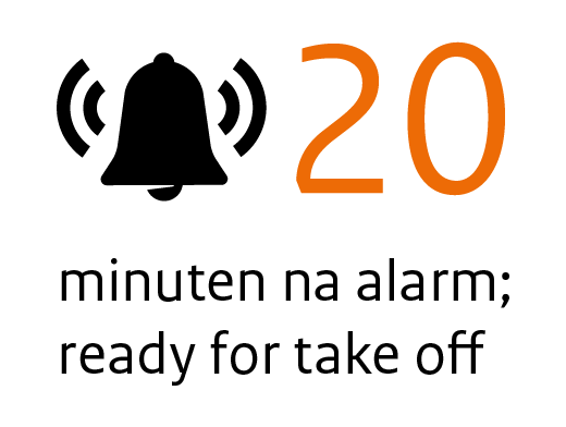 De hulpvraag van de ambulanceverpleegkundige ter plaatse komt binnen bij de meldkamer. Na het alarm spoedt een Aeromedical Evacuation (AE) Team, samen met een NH90-vlieger en een copiloot of tactisch coördinator, zich naar de heli. Het AE-team bestaat uit een AE-arts en een AE-verpleegkundige. Maximaal 20 minuten na melding moet iedereen in ‘de kist’ zitten. Opstarten en wegwezen. Na take-off kan het team in 10 minuten op Vlieland staan.