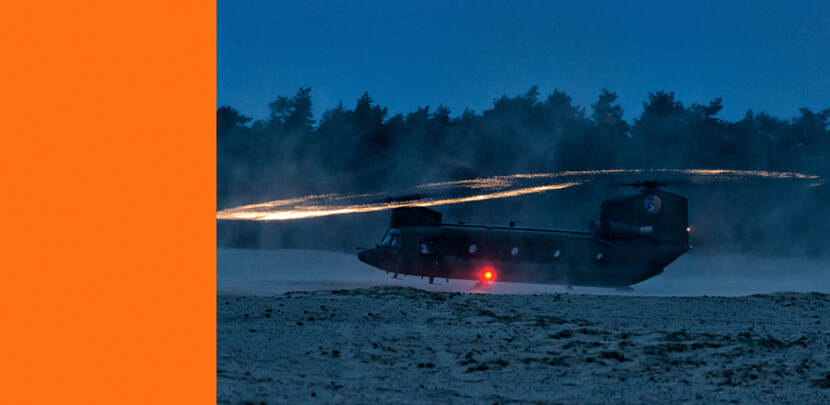 Een avondlanding van een Chinook op het Beekhuizerzandbij Harderwijk resulteerde deze week in een bijzondere foto, waarop het 'Kopp-Etchells effect’ goed zichtbaar is.