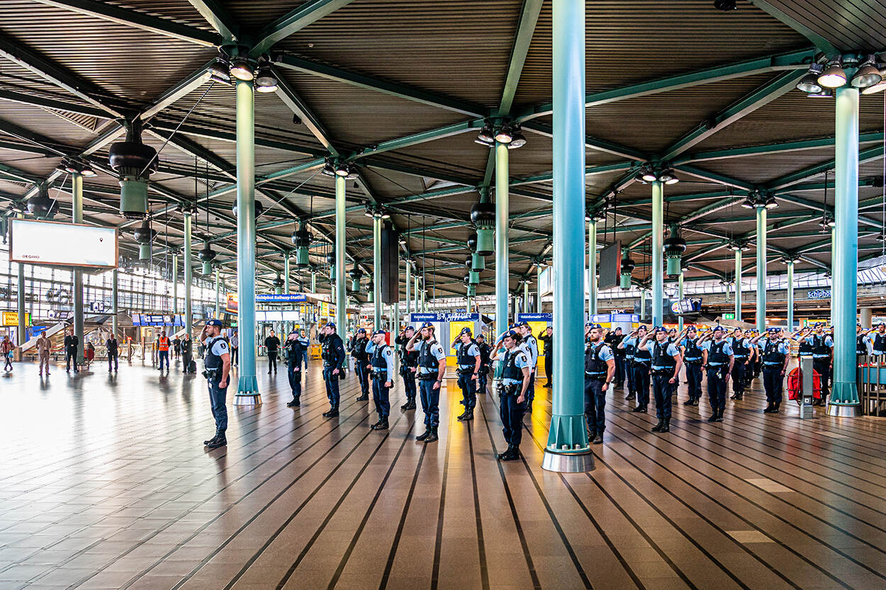 Een foto van de Dodenherdenking op Schiphol leverde dit vrij symmetrische resultaat op. Marechaussees stonden perfect in het gelid met inachtneming van de 1,5 meter maatregel. Foto: PAT.