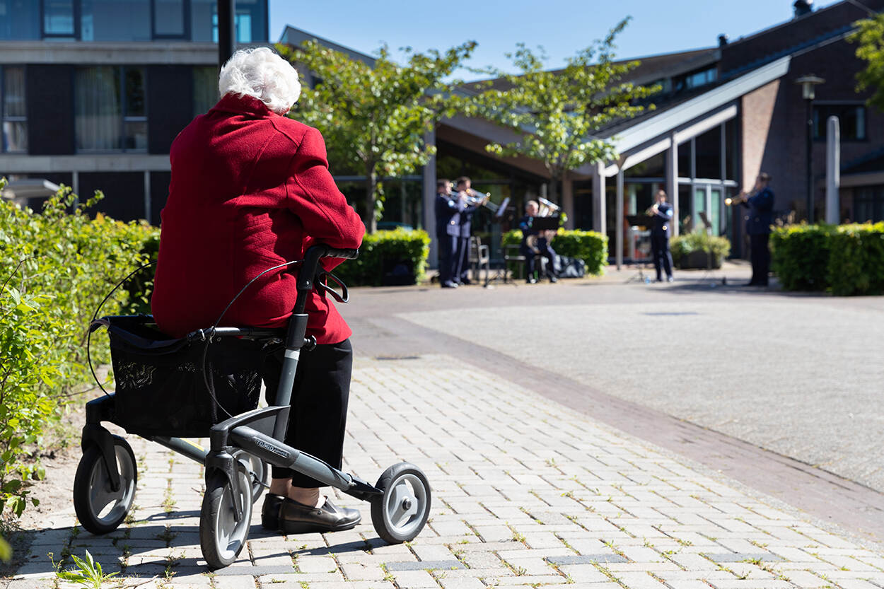 De rollator biedt deze dame een prima zit om het orkest van de luchtmacht te zien spelen voor de ingang van zorgcentrum Sint Franciscus in Gilze. Dit vond plaats op Bevrijdingsdag, om bewoners op te fleuren in deze coronatijd. Foto: sergeant Aaron Zwaal.