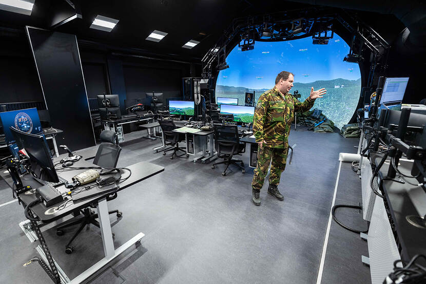 Dit plaatje is niet geschoten in een studio in Hilversum, maar op de legerplaats bij Oldebroek. Sinds kort beschikt de alhier gevestigde Vuursteunschool over een zogenoemde Delta simulator. Dit middel geeft de Fire Support Teams de realistische illusie dat zij zich in het voorterrein bevinden om vuursteun te verlenen. Foto: korporaal Gregory Freni.