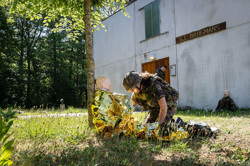 Ook bij het opleiden van landmachters gooit corona flink roet in het eten. Gelukkig is er het Gamified Peer to peer Adaptive Learning, kortweg GPAL. Dit videoplatform maakt het leerlingen van de genezerikkenschool in Hilversum mogelijk om zelfstandig met hun opleiding aan de slag te gaan door eigenhandig instructievideo’s te bekijken en eventueel feedback te geven. Op de foto zie je een leerling levensreddende handelingen verrichten. Beelden daarvan worden later klassikaal met GPAL verspreid. Foto: korporaal Gregory Freni.