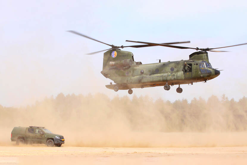 Dit plaatje lijkt afkomstig uit een scene van de televisieserie A-team. Een Chinook transporthelikopter van 298 Squadron past op de Oirschotse Heide een car blocking toe op een Amarok-terreinwagen. Deze techniek wordt te velde toegepast om een mogelijk vijandig voertuig tot stoppen te dwingen. De brown-out van opwaaiend zand geeft de kiek een ietwat Hollywood-achtige uitstraling. Foto: Willem-Sander Termorshuizen.