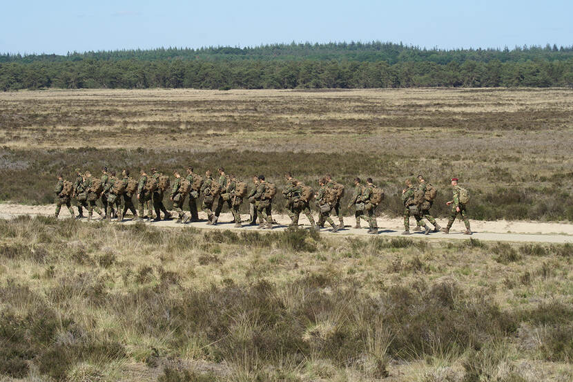 Na de lockdown door COVID-19 komen de meeste opleidingen en trainingen bij de landmacht weer op gang. Zo ook op de Edesche Heide waar recent een schoolpeloton van 11 Luchtmobiele Brigade terug naar hun verzamelplaats marcheert. Foto: Jacco van de Weerd.