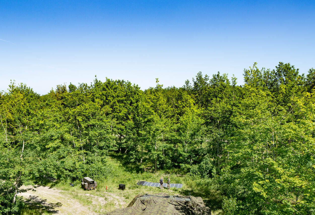 Een nadeel is dat de panelen goed zichtbaar zijn vanuit de lucht. “We hebben ook getest met het afdekken met camouflagenetten, maar dan verlies je 75% van de opbrengst. Het is dus een keuze.”