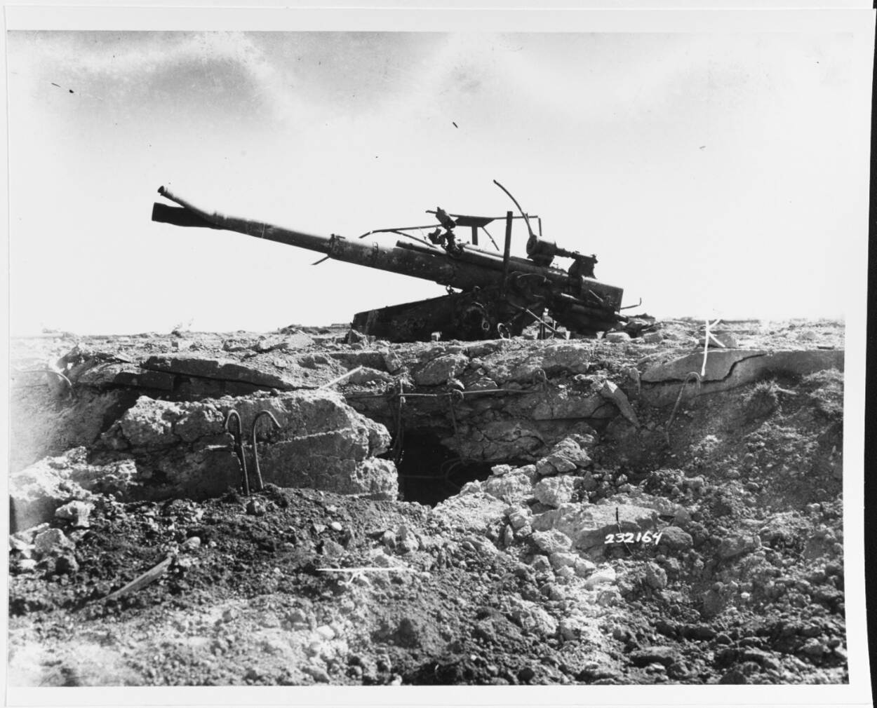 Aan het eind van de oorlog is er van de Duitse oorlogsmachine niet veel over. Ook dit Duitse kanon staat er troosteloos bij in Brest. Foto: National Archives.