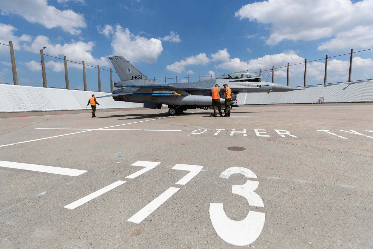 Dit plaatje had genomen kunnen zijn op een verre vliegbasis ergens in het westen van de Verenigde Staten, waar F-16’s van de luchtmacht vaak oefenen. De foto geeft echter de J-163 weer, die onlangs op Schiphol een voorzorgslanding maakte na een vogelaanvaring. Foto: sergeant Jan Dijkstra.