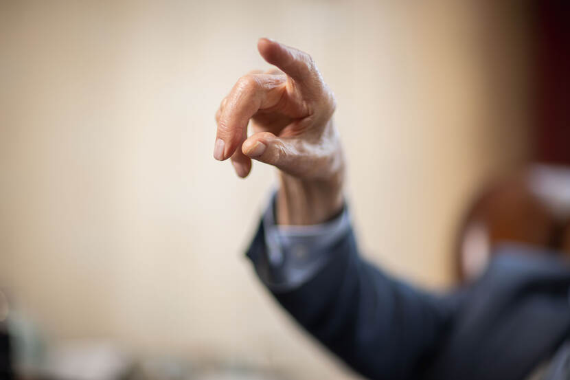 Deze vingerbeweging drukt iets uit van ‘wat ik nog wil zeggen’. Het zou goed kunnen dat de eigenaar van de hand op dat moment die gedachte had. Oud-grenadier Paul Moerman is namelijk 103 jaar oud. Onlangs werd hij voor het blad Landmacht bevraagd over zijn diensttijd tijdens de Duitse inval in 1940. Sergeant Jasper Verolme verzorgde dit mooie karakteristieke beeld.