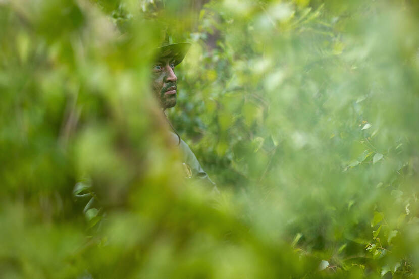Deze militair lijkt zich af te vragen waar hij in hemelsnaam is terechtgekomen. Na een crash met een vliegtuig in vreemd, vijandelijk gebied is het heel logisch dat je je moet oriënteren. En dat is precies waar het om draait bij de Survival Evasion Resistance and Extraction School. De cursist op de kiek werd gespot tijdens een training die dit instituut van de luchtmacht recent verzorgde. Foto: sergeant Jasper Verolme.