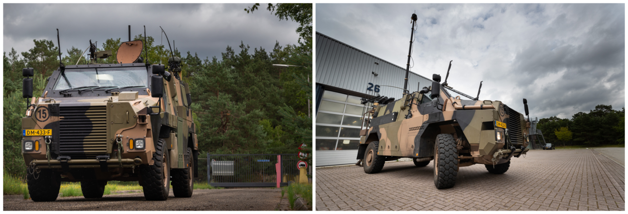 Aan de buitenkant vallen verschillende antennes bovenop het voertuig het meest op. Daardoor doet ‘ie ietwat stekelig aan. Met 1 druk op de knop komen die antennes omhoog. Aan boord is nog een extra set aanwezig. “Die kunnen we met 2 man op een tactische plek met goed overzicht neerzetten. Je kunt dan vanaf 2 plekken hetzelfde meten en die informatie combineren, een zogenoemde kruispeiling. Daarmee is de positie van vijandelijke radiosystemen nóg veel exacter te bepalen.”