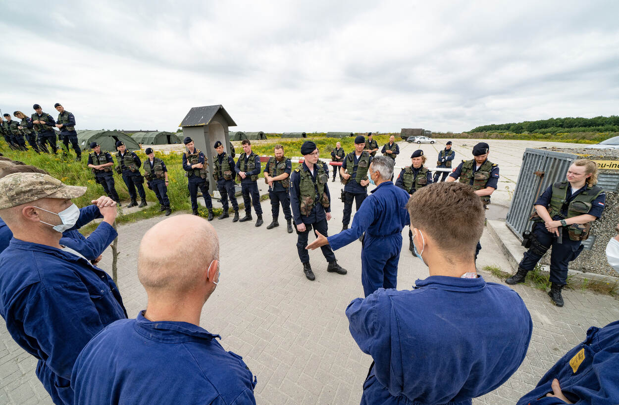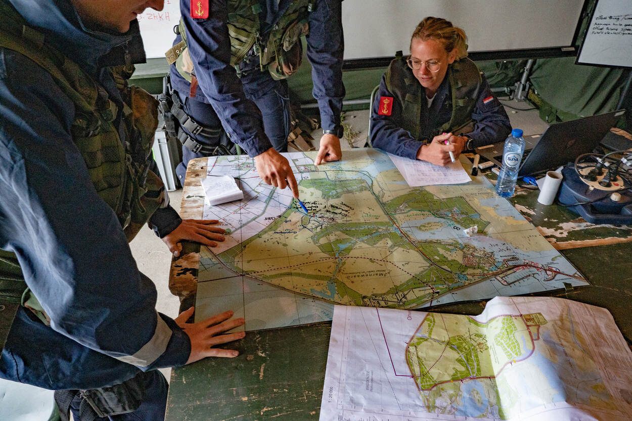 Het militaire oefendorp Marnehuizen vormde deze week het decor van een oefening voor 60 adelborsten van het Koninklijk Instituut voor de Marine (KIM). De instructeurs maakten van een nood een deugd, vertelt kapitein der mariniers Jelte, tevens Leider der Oefening. “Normaliter focussen we vooral op amfibisch optreden vanaf een schip, maar het vaartuig is in onderhoud. Dat biedt ons de kans deze oefening eens ‘groen’ aan te pakken. Voor het eerst in Marnehuizen.”