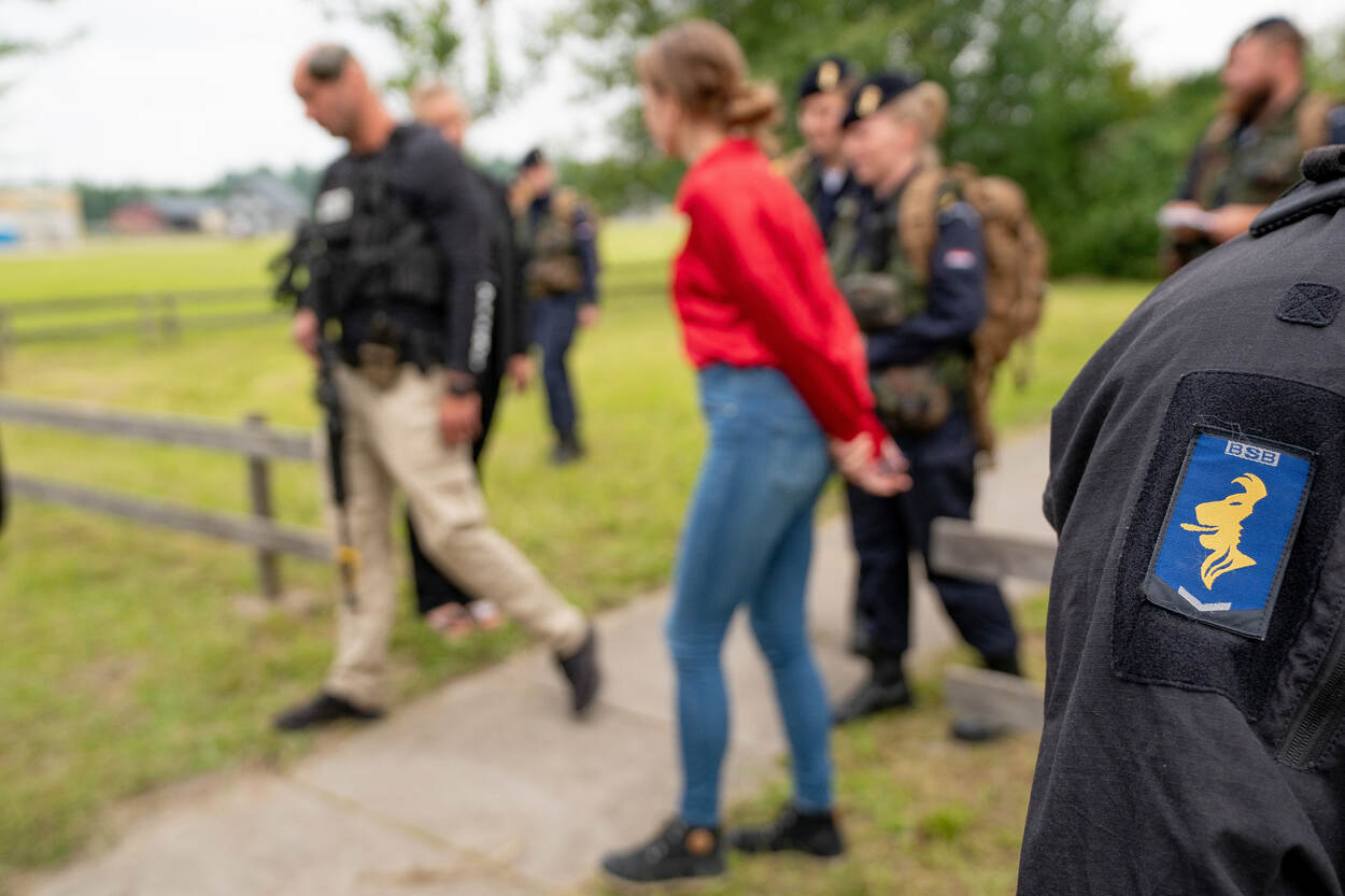 Verschillende ‘oefenvijanden’ legden de adelborsten het vuur aan de schenen. Mariniers traden op als boze burger, maar ook acteurs werden ingezet. Kers op de taart was de aanwezigheid van de Brigade Speciale Beveiligingsopdrachten (BSB) van de marechaussee, die de ‘minister van Binnenlandse Zaken’ (dame in het rood) vergezelden tijdens haar tour door het rampgebied.