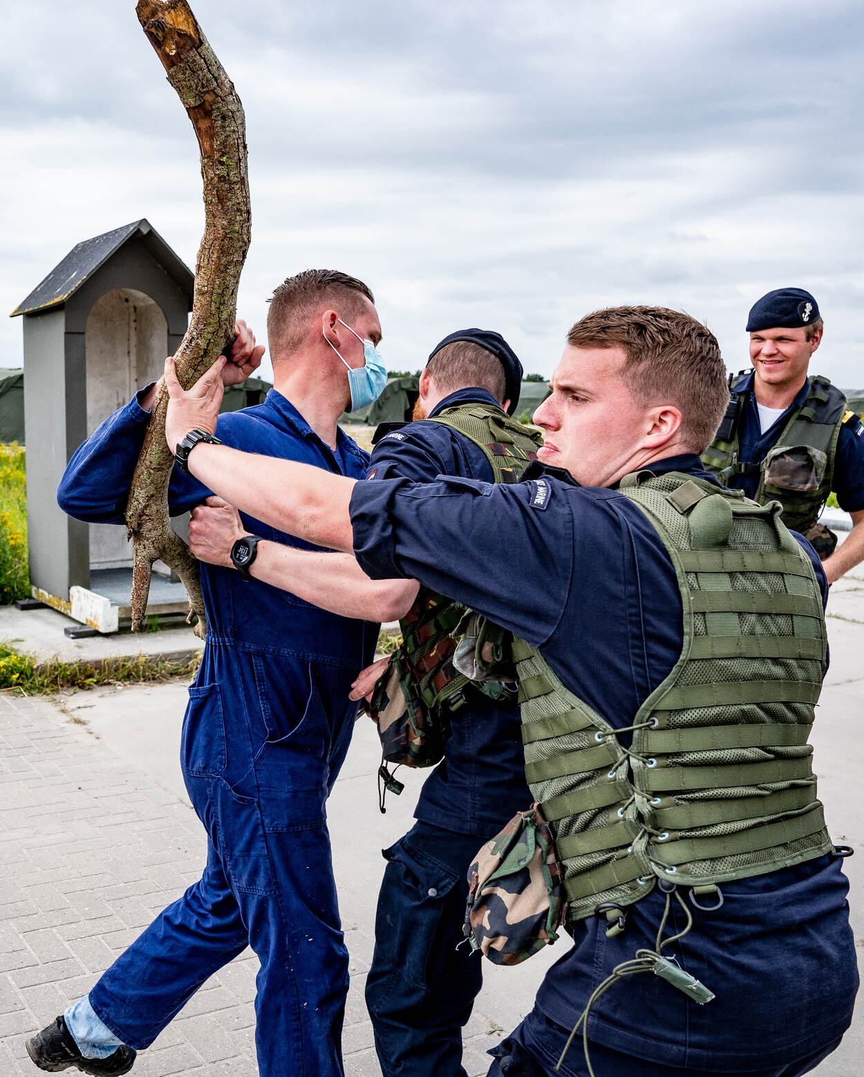 “Het scenario maakt echt dat we allemaal goed in het spel zitten”, vertelt ze. “Wel is het even wennen. De oefening is erg uitdagend en tegelijkertijd chaotisch. Heel anders dan optreden vanaf een schip. Je ziet dat er qua kennis in landoptreden nog veel te winnen valt. Daarom vind ik het mooi dat we deze oefening juist hier doen. Het is continu schakelen.”