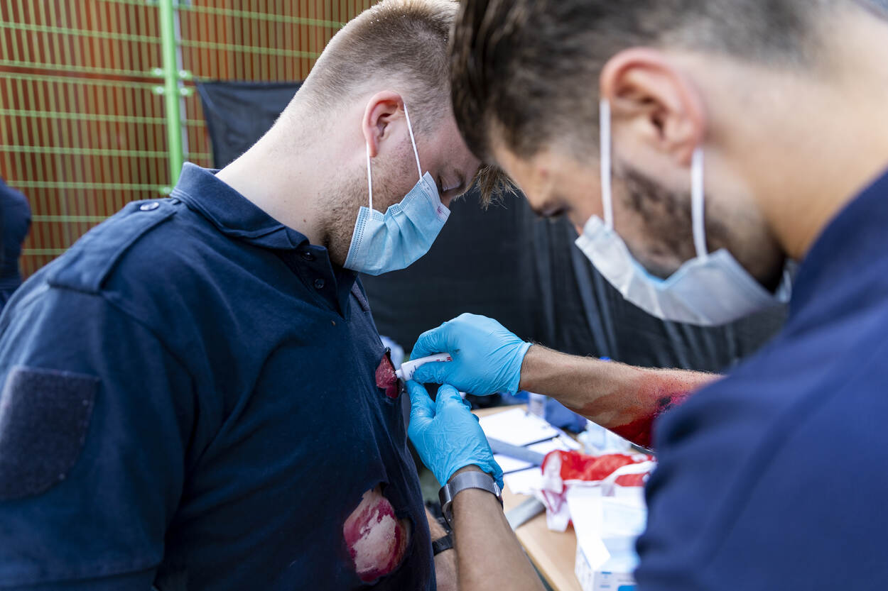 Wanneer de dreiging in het scenario is weggenomen, kan de situatie worden beoordeeld. Door middel van zogenoemde triage worden de slachtoffers ingedeeld naar de ernst van de verwondingen of ziektebeeld. De 9 GBB’ers die deelnamen aan deze 5-daagse training, oefenden vanwege COVID-19 zoveel mogelijk in vaste buddyparen. Normaal gesproken gebeurt dit in klaslokalen, maar voor de gelegenheid werd er nu gebruik gemaakt van de sportvelden op de Koningin Máxima Kazerne zodat de scenario’s ruimer opgezet konden worden.