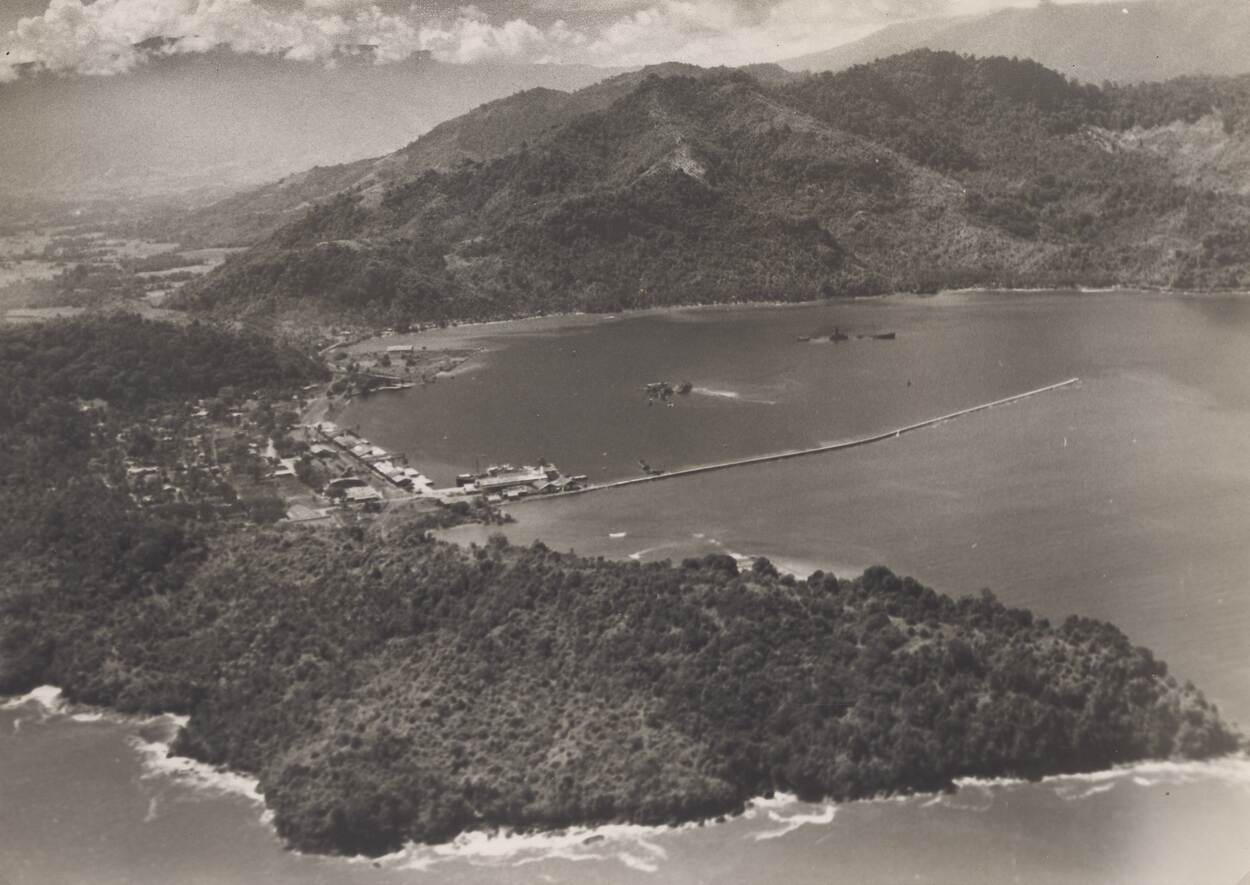 Luchtfoto van Padang met op de voorgrond de Emmahaven. De plek waar de broers Haacke zijn geboren.