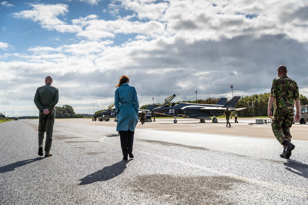 Zoals is te zien, bracht staatssecretaris van Defensie Barbara Visser geheel in overeenstemming met de corona-regels een bezoek aan vliegbasis Leeuwarden. De bewindsvrouw liet zich bijpraten over de F-35 in het algemeen en de vorming van het eerste F-35 squadron op de noordelijke vliegbasis in het bijzonder. Foto is van sergeant Jan Dijkstra.