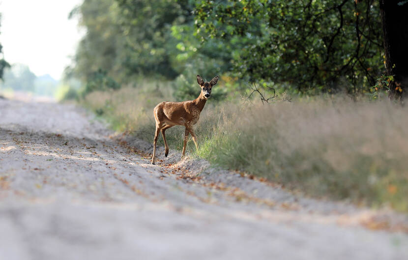 Voor dit lieflijke reetje op de Leusderheide was het ook vakantie. Nu er een paar weken geen militair verkeer was, durfde zij best uit het struikgewas te komen om fotograaf Ad Stegeman eens wat beter van dichtbij te bekijken.