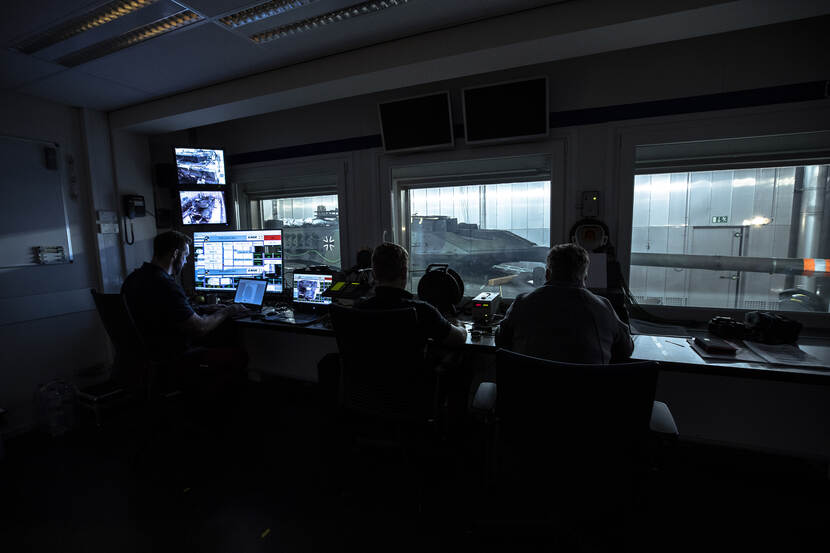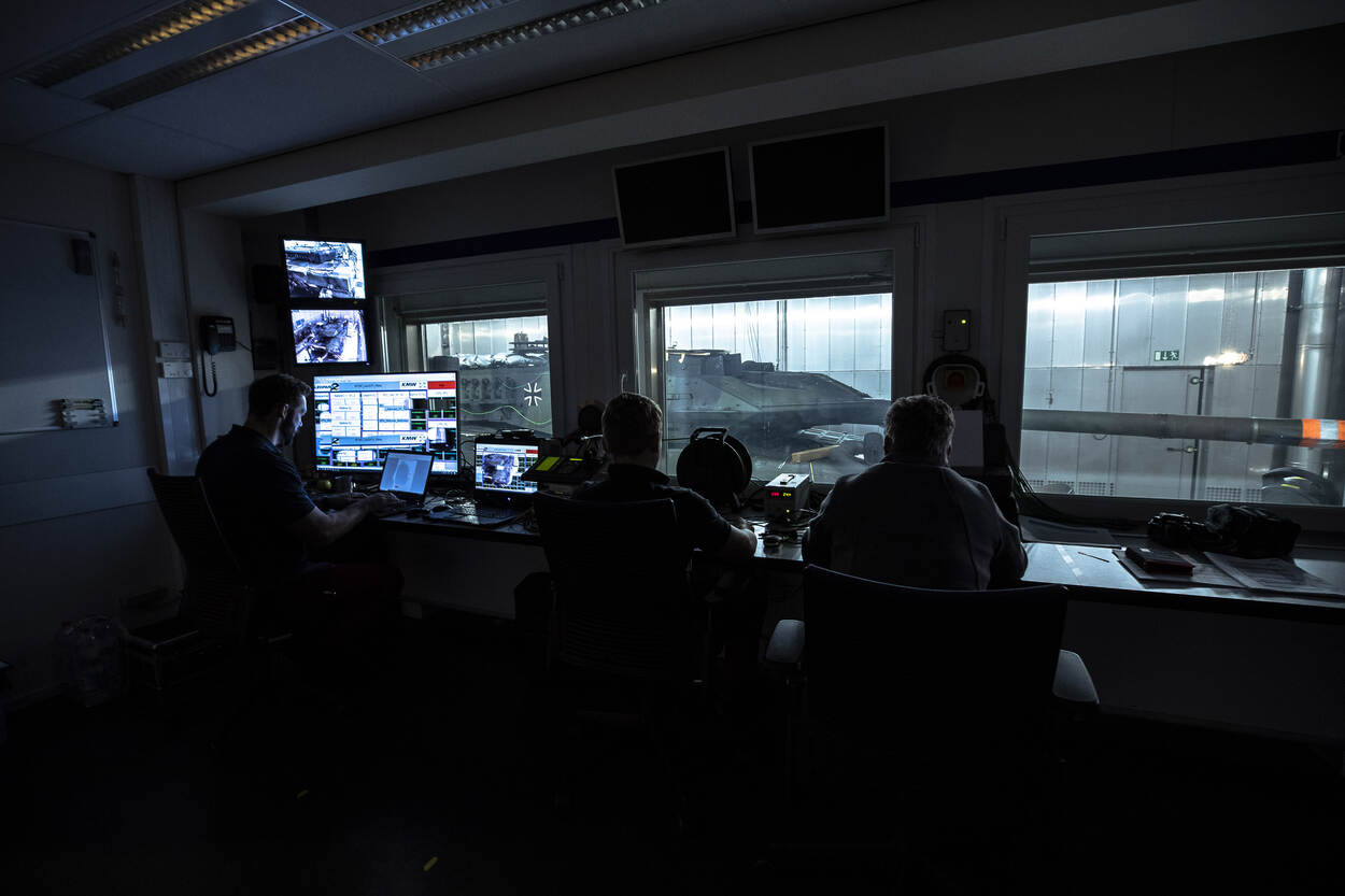 Personeel van Krauss-Maffei Wegmann (KMW) in de observatieruimte van de klimaatkamer. Hier komt alle informatie van de sensoren op de tank binnen in het eigen softwaresysteem.