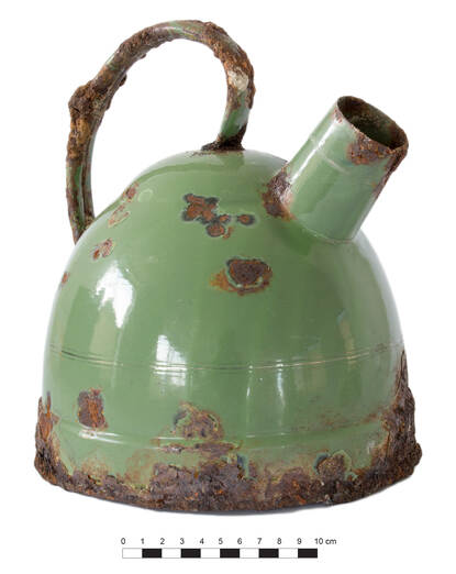 Naast de kazemat vond de archeoloog een grote put met meerdere lagen kachelafval. “Uit de archieven weten we dat de Duitsers de Nederlandse keuken hebben verbouwd. In de put kwamen we blikken met witte en gele verf tegen, dezelfde kleur die in de kazemat gebruikt is. Ook lagen er een pot voor Sauerkraut, wekpotten en een kapotte Duitse radio.” Zuurkool aten de Duitsers hier dus, met vlees. Ze hadden ook een huisdier. “Tussen de resten vonden we botjes van een schaap of varken met tandafdrukken van een hond. Die liep hier dus rond bij de militairen. Om het vuur aan te maken gebruikten ze vaak het kruit uit een huls. Die verbande hulzen vonden we dan weer tussen de kooltjes.”