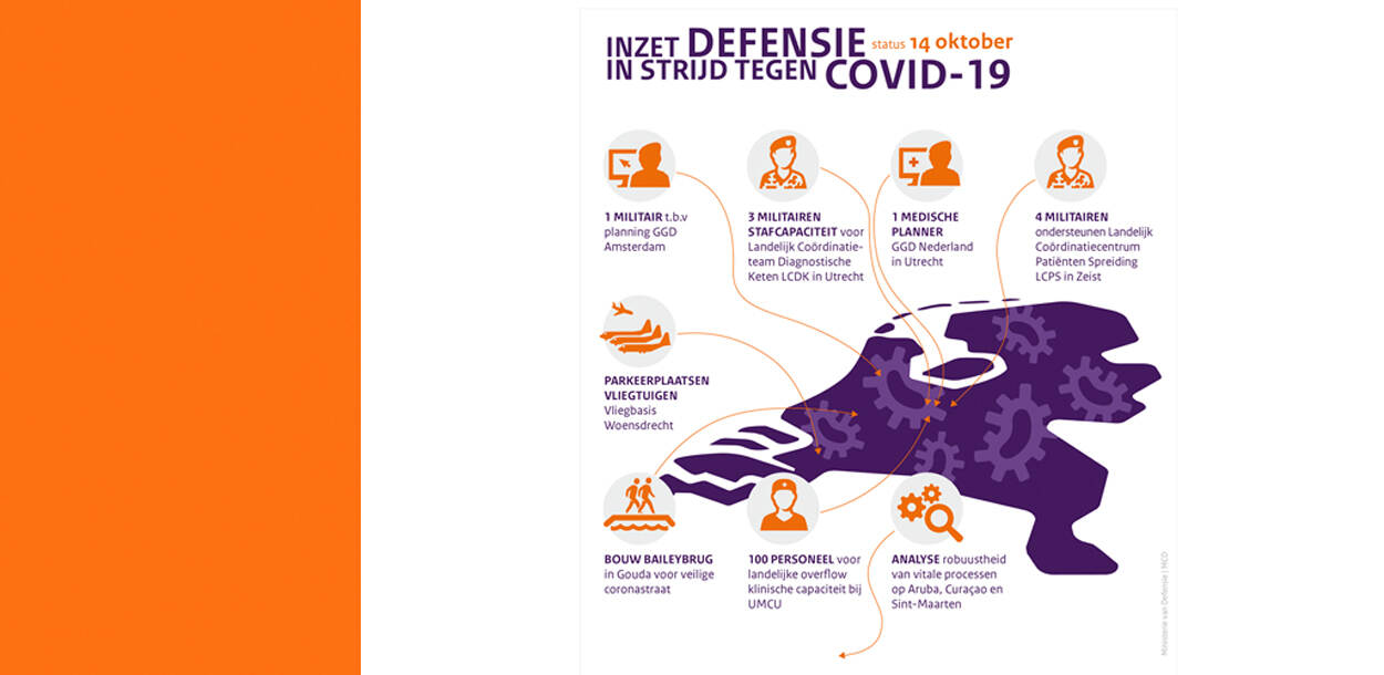 Defensie ondersteunde ook in de periode van 11 maart tot en met 1 juli de civiele autoriteiten in de strijd tegen het coronavirus. Sinds het aantal besmettingen weer toeneemt, is ook Defensie weer in actie gekomen.  Zo bouwde de genie van de landmacht vorige week een noodbrug in Gouda, waardoor de coronateststraat in de stad beter bereikbaar werd.