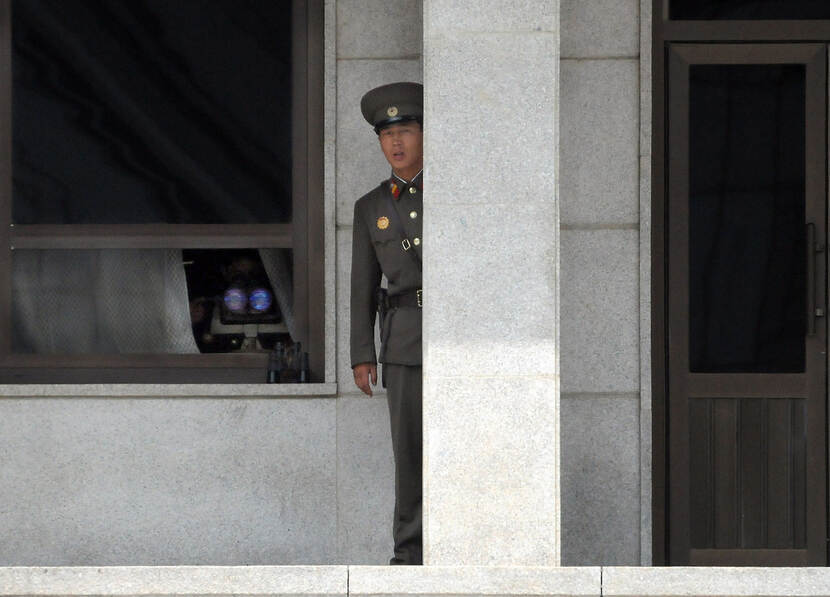 Een Noord-Koreaanse militair gluurt naar het zuiden. Foto: Amerikaanse strijdkrachten.