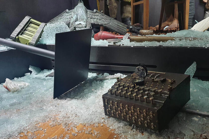 Een foto van de schade in het Eyewitness Museum in Beek