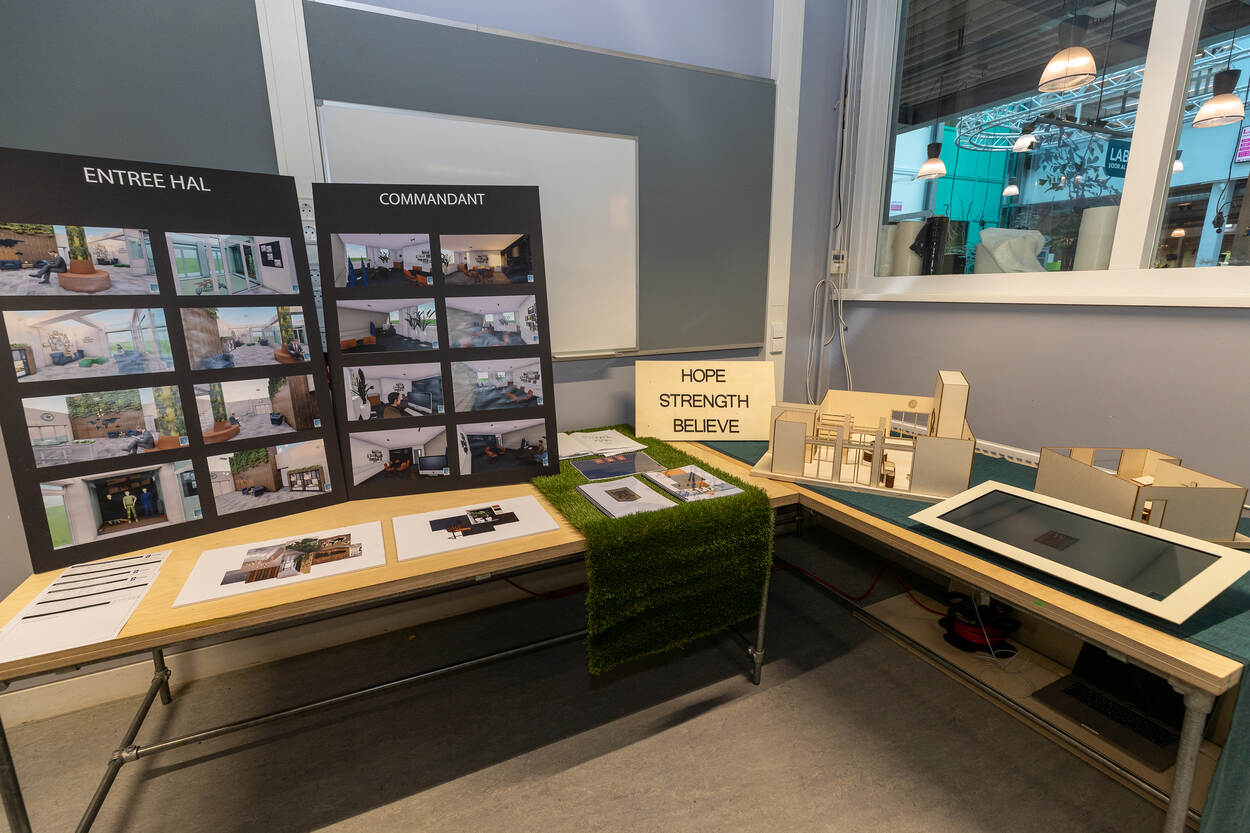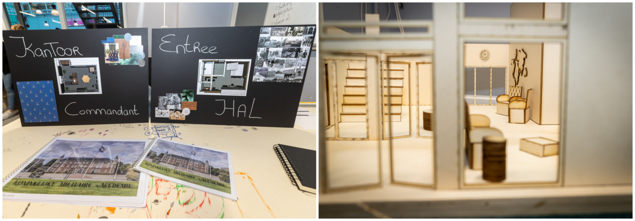 Zo gezegd, zo gedaan: 3D-visualisaties, plattegronden, interieurvoorstellen met bijbehorende kosten, collages vol materialen en fraaie maquettes. De studenten trokken in 2 weken tijd alles uit de kast om de staf te overtuigen. In eerste instantie alleen voor de entree en het kantoor van de commandant. Wellicht daarna voor de rest van het gebouw.