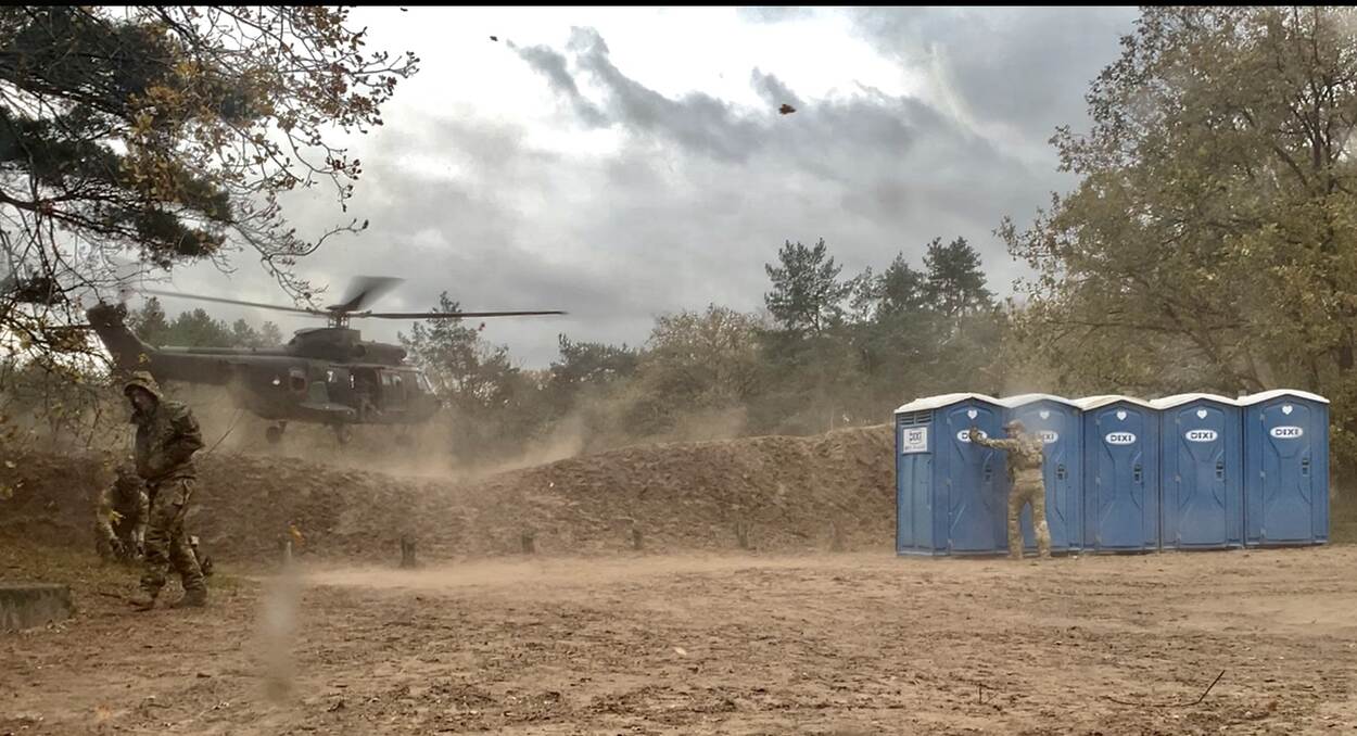 Sergeant van de mariniers Pieter Ros legde vast hoe de downwash van een Cougar transportheli vat kreeg op een rijtje dixi’s. Voordat de portable toiletten weggeblazen zouden worden, zag een operator van het Korps Commandotroepen kans het plastic sanitair op zijn plaats te houden. De vliegbewegingen boven de Oirschotse Heide behelsden het beoefenen van special operations drills.