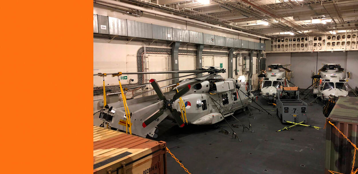Het amfibisch transportschip Zr.Ms. Johan de Witt heeft momenteel liefst 3 NH90 helikopters aan boord. Een primeur.
