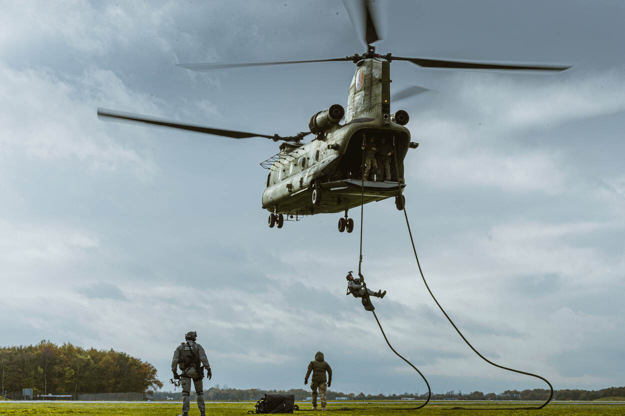 Uit een stil hangende helikopter klimmen en via een vuistdik touw naar beneden glijden. Maximaal dertig meter met enkel je handen en voeten om veilig je weg naar de grond te vinden. De zwaartekracht zijn werk laten doen: het ziet er makkelijk uit, maar dat is het allerminst.
