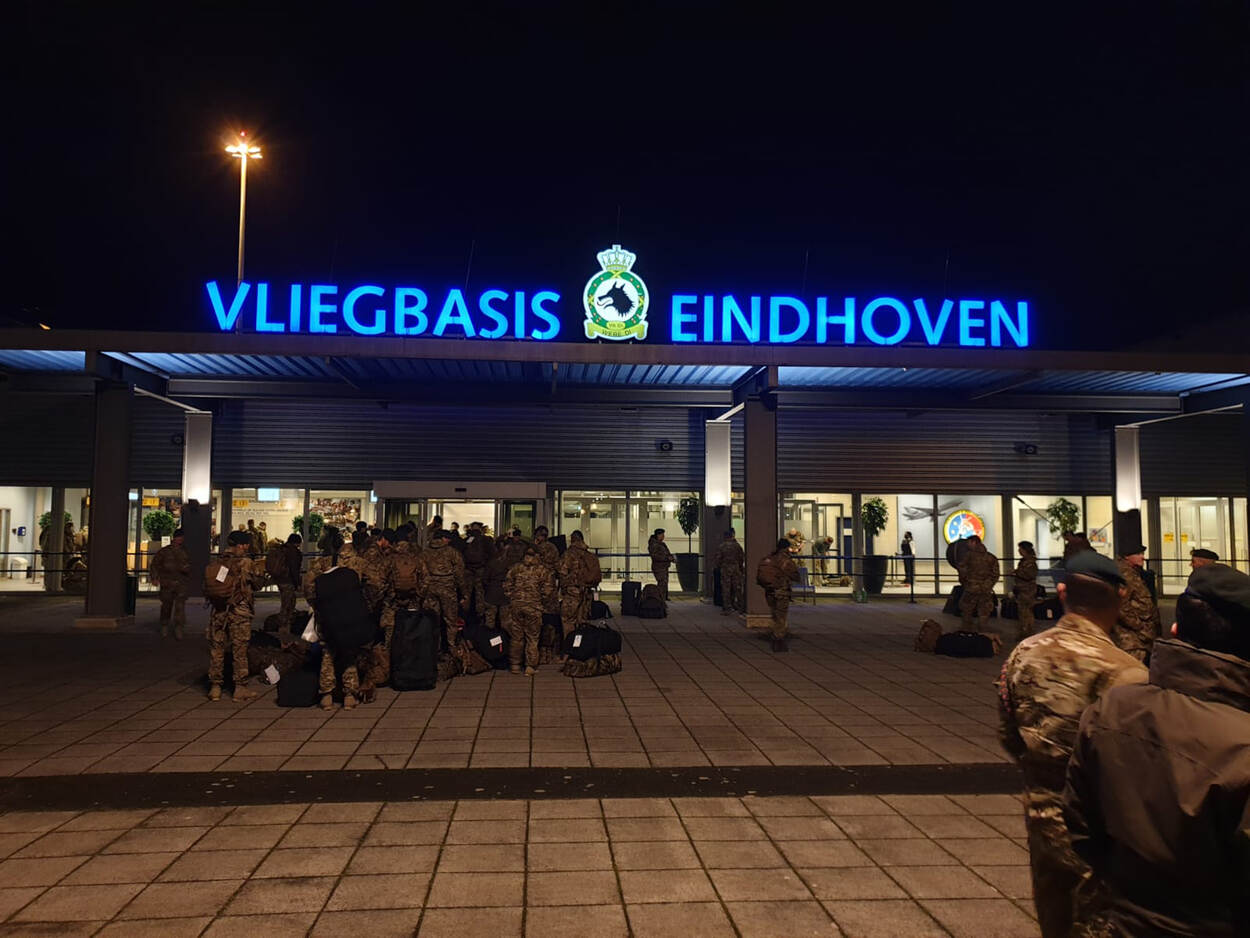 De blauwverlichte letters 'vliegbasis Eindhoven' geven deze foto van 13 Lichte Brigade een beetje mysterieus, bijna spooky karakter. Het was nog vroeg in de ochtend toen de militairen, met standplaats Oirschot, zich meldden voor hun vlucht naar Litouwen. De landmachters gaan er deel uitmaken van de enhanced Forward Presence, de NAVO-eenheid van dienst in Litouwen.