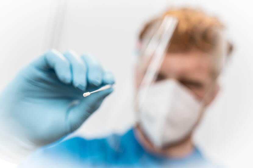 Shots als deze ondersteunden de afgelopen maanden menig verhaal in krant of tijdschrift. In de rubriek LENS drukken we deze foto van fotograaf sergeant Sjoerd Hilckmann af, omdat dit beeld ook vandaag nog steeds actueel is. Et voilà: een militair in vol ornaat staat op het punt een coronatest af te nemen. Plaats is de COVID-19 Testlocatie XL nabij luchthaven Schiphol.