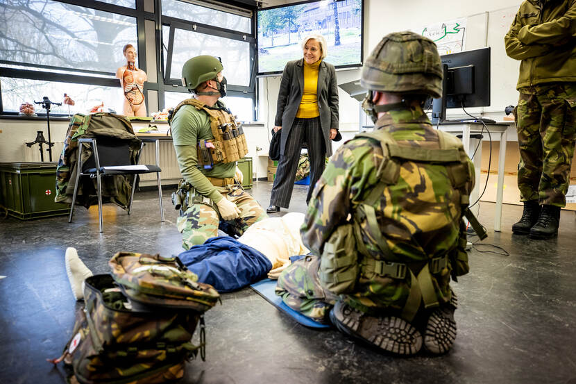 Minister van Defensie Ank Bijleveld bracht vorige week een werkbezoek aan het Defensie Gezondheidszorg Opleidings- en Trainingscentrum op de Korporaal van Oudheusdenkazerne in Hilversum. De toen nog niet demissionaire bewindsvrouw nam een kijkje bij een les Zelfhulp Kameradenhulp. De opname is van sergeant 1 Mike de Graaf.