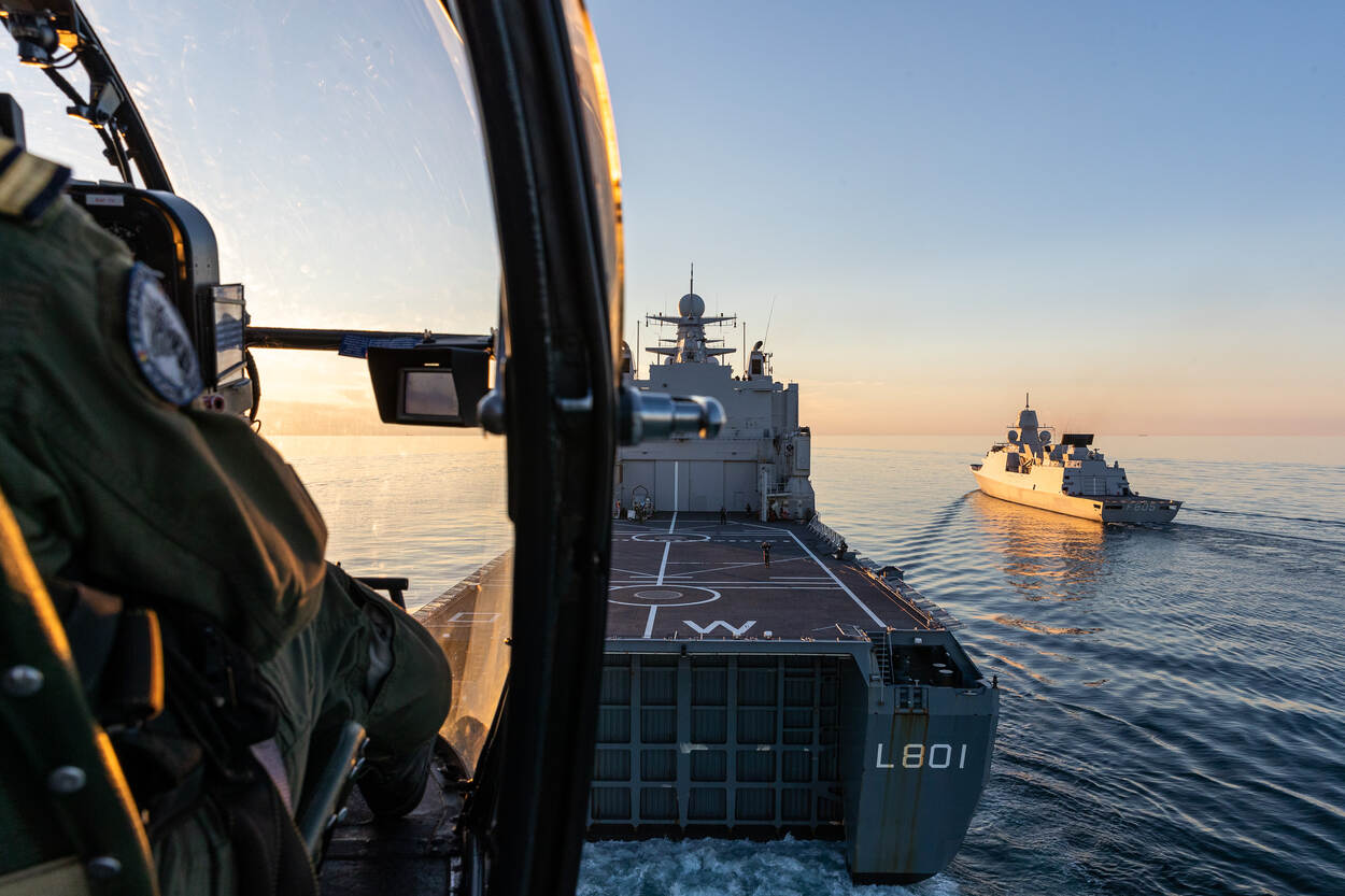 De foto is in september 2020 genomen tijdens de Continuation Cruise; een oefening van vier Nederlandse marineschepen. Ze trainden met verschillende buitenlandse eenheden op de Noordzee, Skagerrak en het Kattegat. Met een mediateam sloot ik twee weken aan. Zr.Ms. Johan de Witt en Zr.Ms. Rotterdam oefenden in deze weken met het Korps Mariniers en het Stingerpeloton van de landmacht. Heel dynamisch.
