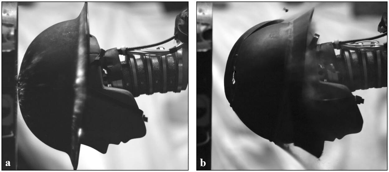 Een Franse en een moderne helm worden getest. De kam op de Franse helm kan eraan hebben bijgedragen dat de helm beter beschermt tegen schokgolven dan de moderne variant.