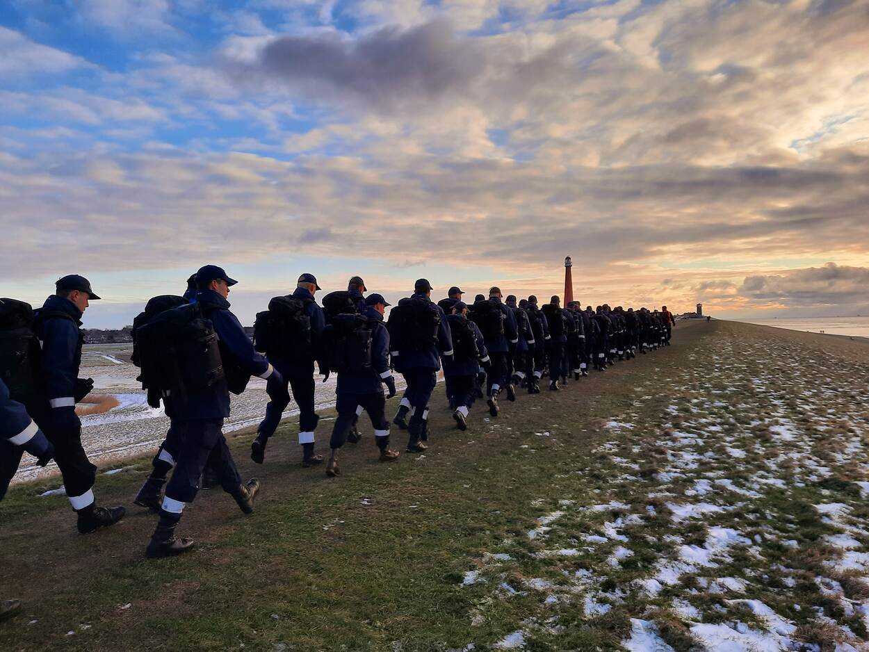Andrew Rep stuurde deze sfeervolle plaat van een klasje deelnemers aan de Eerste Maritieme Militaire Vorming. Op hun, naar zijn zeggen, ‘zwarte Cadillacs’ liepen zij de zogenoemde middenmars door Den Helder. De route is twaalf kilometer lang en voert door stad en land.